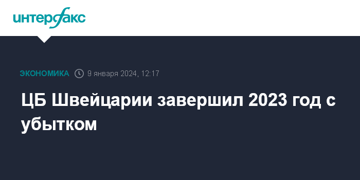 Москва. 9 января. INTERFAX.RU - Швейцарский национальный банк (SNB) получил по итогам 2023 года чистый убыток в размере 3 млрд франков ($3,5 млрд), сообщается в предварительной отчетности ЦБ.