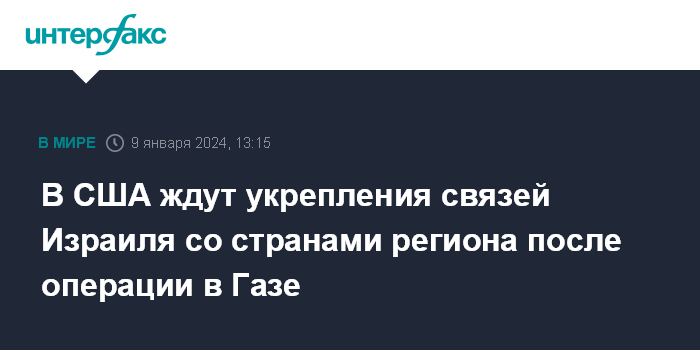 Москва. 9 января. INTERFAX.RU - Госсекретарь США Энтони Блинкен выразил надежду на то, что Израилю удастся добиться более тесных отношений со странами ближневосточного региона после окончания военной операции в секторе Газа.
