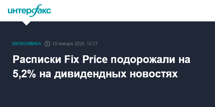 Москва. 10 января. INTERFAX.RU - Глобальные депозитарные расписки Fix Price подорожали в начале торгов на "Московской бирже" в среду на 5,2% (до 322 рублей за штуку) на дивидендных новостях.