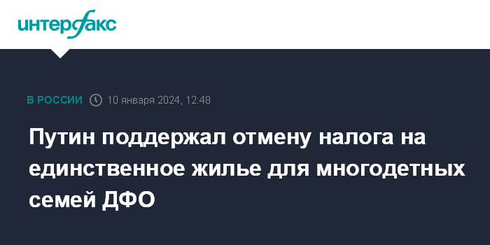 Москва. 10 января. INTERFAX.RU - Президент Владимир Путин поддержал предложение жителя Анадыря освободить многодетные семьи Дальнего Востока от налога на единственное жилье.