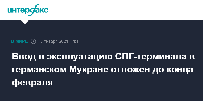 Москва. 10 января. INTERFAX.RU - Запуск СПГ-терминала в германском порту Мукран на балтийском побережье отложен до конца февраля для завершения строительных работ, прерванных штормами.