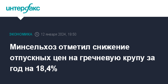 Москва. 12 января. INTERFAX.RU - Отпускные цены на гречневую крупу в РФ за год (по данным на 10 января 2024 года) снизились на 18,4%, причем за последние две недели – на 2,6%, сообщил Минсельхоз в пятницу.