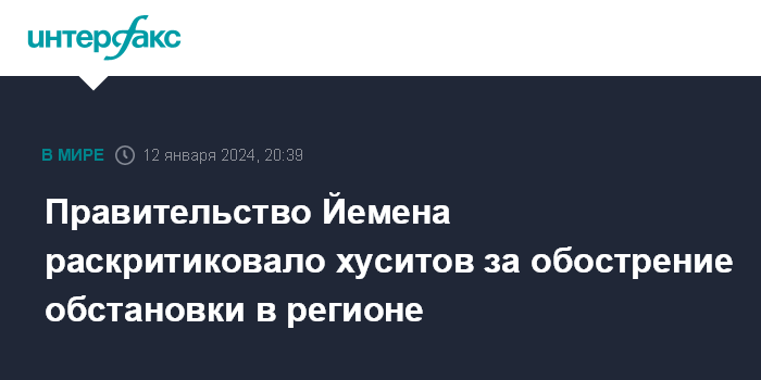 Москва. 12 января. INTERFAX.RU - Признанное мировым сообществом правительство Йемена считает удары США и Великобритании по территориям страны ожидаемым ответом на продолжающиеся нападения мятежников-хуситов на суда, сообщают в пятницу западные СМИ.