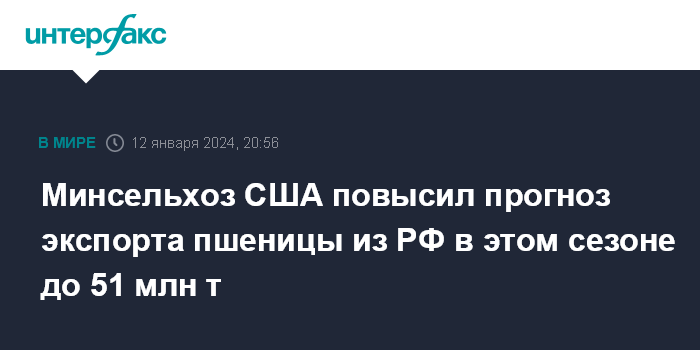 Москва. 12 января. INTERFAX.RU - Минсельхоз США в январском обзоре повысил на 1 млн тонн прогнозы экспорта пшеницы из РФ и ее сбора в этом сельхозгоду (июль 2023 - июнь 2024 гг.).