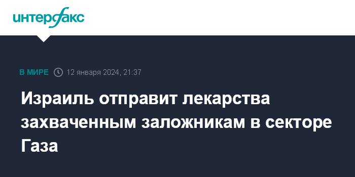 Москва. 12 января. INTERFAX.RU - Израиль в ближайшие дни передаст в сектор Газа медикаменты для заложников, которых группировка ХАМАС захватила во время нападения в октябре 2023 года. Об этом сообщает The Times of Israel со ссылкой на офис израильского премьер-министра Биньямина Нетаньяху.