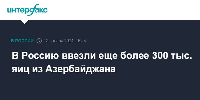 Москва. 13 января. INTERFAX.RU - Азербайджан в субботу поставил в Россию очередную партию яиц объемом в 18,63 тонны (306 тыс. шт.).