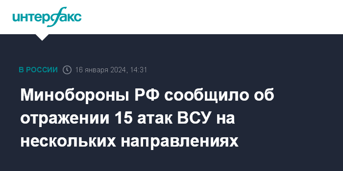 Москва. 16 января. INTERFAX.RU - Российские военные отразили шесть атак вооруженных сил Украины (ВСУ) на купянском направлении, четыре - на краснолиманском и пять - на донецком направлениях, сообщили в Минобороны РФ во вторник.