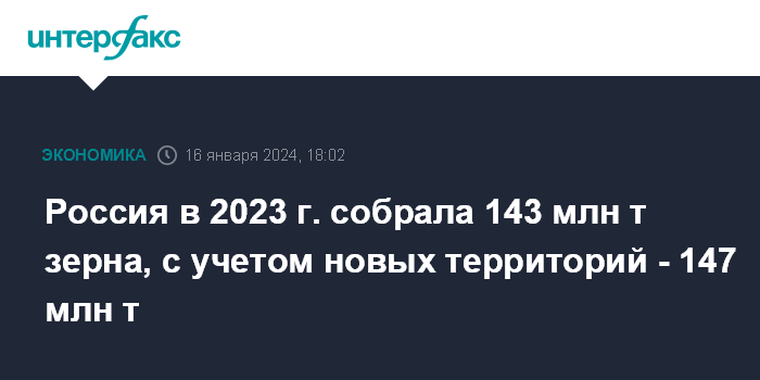 Напомнив, что в 2022 году РФ собрала рекордный урожай зерна в 157,6 млн тонн, Путин заявил: "И в 2023 году (собрали - ИФ) 143 млн тонн, плюс новые территории, плюс еще 4 млн тонн - 147 млн тонн будет. Очень хорошие показатели, всех селян еще раз хочу поблагодарить за эти результаты".