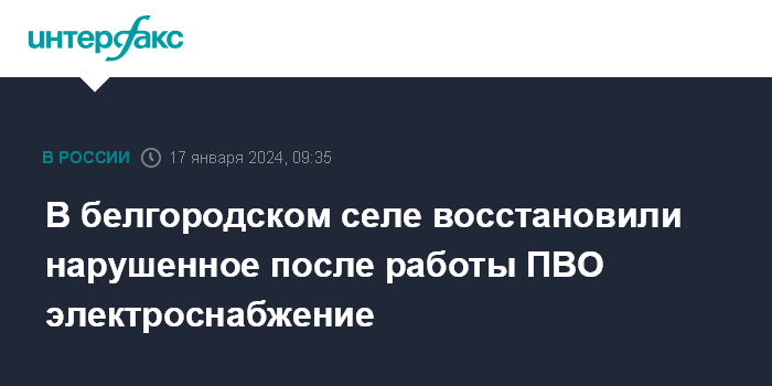 Москва. 17 января. INTERFAX.RU - Губернатор Белгородской области Вячеслав Гладков сообщил о последствиях работы системы ПВО в ночь на среду; в одном из местных сел по этой причине было нарушено электроснабжение.