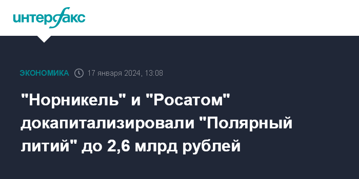 "Норникель" и "Росатом" докапитализировали "Полярный литий" до 2,6 млрд рублей