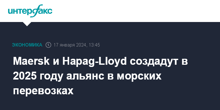 Москва. 17 января. INTERFAX.RU - Датская A.P. Moeller-Maersk и германская Hapag-Lloyd, ведущие компании в сфере морских перевозок, объявили, что создадут альянс Gemini Cooperation для совместного использования судов и повышения эффективности перевозок.