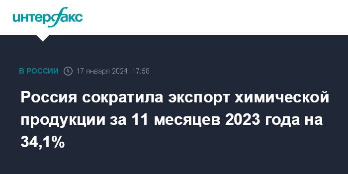 Россия сократила экспорт химической продукции за 11 месяцев 2023 года на 34,1%