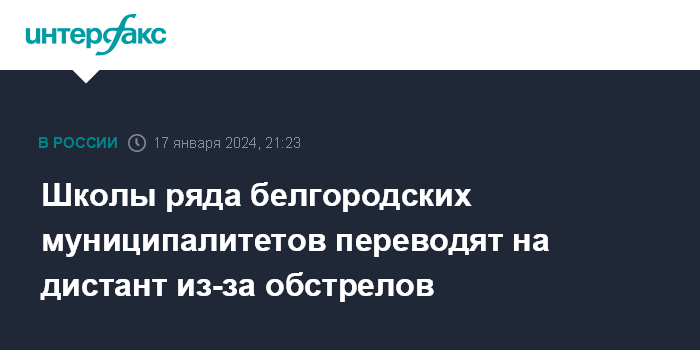 Москва. 17 января. INTERFAX.RU - Губернатор Белгородской области Вячеслав Гладков сообщил о введении дистанционного обучения школьников и студентов, получающих среднее профессиональное образование (СПО), в приграничных и ряде других муниципалитетов региона из-за оперативной обстановки.