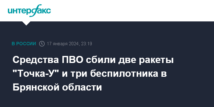 Средства ПВО сбили две ракеты "Точка-У" и три беспилотника в Брянской области