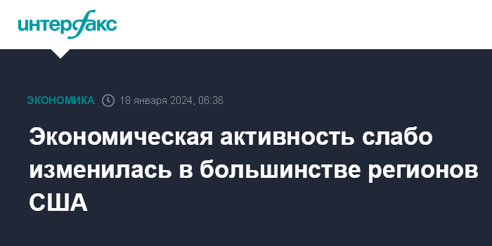 Москва. 18 января. INTERFAX.RU - Уровень экономической активности изменился слабо или не изменился вовсе в большинстве регионов США в декабре - начале января, говорится в опубликованном в среду Федеральной резервной системой (ФРС) региональном обзоре, который по цвету обложки называют Beige Book ("Бежевая книга").