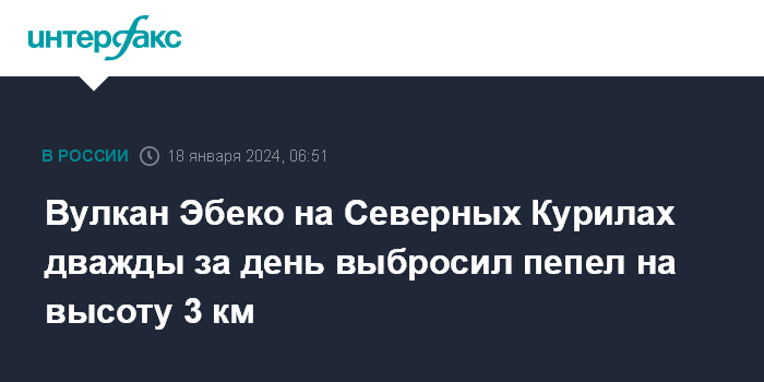 Москва. 18 января. INTERFAX.RU - Вулкан Эбеко, расположенный на северокурильском острове Парамушир, второй раз за день в четверг выбросил столб пепла на высоту до 3 км над уровнем моря, сообщает пресс-служба ГУ МЧС региона.