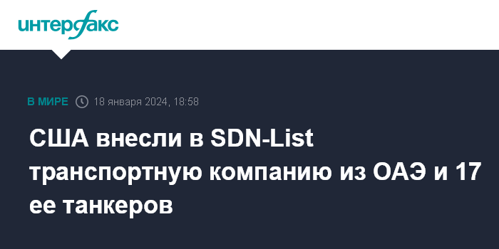 Москва. 18 января. INTERFAX.RU - Соединенные Штаты внесли в санкционный список транспортную компанию из ОАЭ Hennesea Holdings за перевозку российской нефти выше price cap в $60/барр., 17 ее танкеров также внесены в SDN-List. Об этом говорится в сообщении Управления по контролю за иностранными активами Минфина США (OFAC).