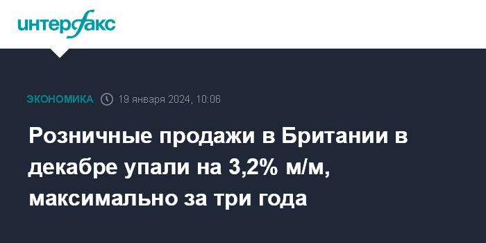 Москва. 19 января. INTERFAX.RU - Розничные продажи в Великобритании в декабре рухнули на 3,2% по сравнению с предыдущим месяцем, говорится в отчете Национального статистического управления (ONS).