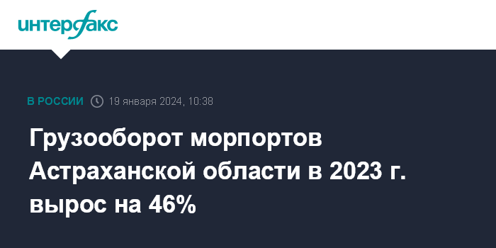 Москва. 19 января. INTERFAX.RU - Суммарный грузооборот морских портов Астрахань и Оля за 2023 год составил 4,3 млн тонн, что на 46% больше по сравнению с 2022 годом, сообщает управление пресс-службы и информации администрации губернатора Астраханской области.