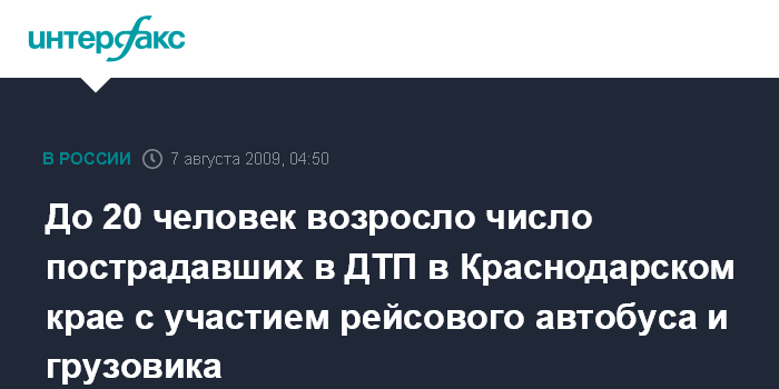 Ростов-на-Дону. 7 августа. ИНТЕРФАКС-ЮГ - При столкновении двухэтажного автобуса "Сетра" и грузового автомобиля "Рено" на автотрассе "Дон" на участке дороги в Краснодарском крае 20 человек получили травмы различной степени тяжести, сообщили агентству "Интерфакс-Юг" в Южном региональном центре МЧС.