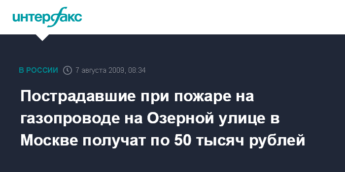 Москва. 7 августа. INTERFAX.RU - Правительство Москвы утвердило размер единовременной материальной помощи лицам, пострадавшим в результате аварии на газопроводе, произошедшей 10 мая на Озерной улице на западе Москвы, сообщили "Интерфаксу" в пятницу в городской администрации. По словам собеседника агентства, мэр Москвы Юрий Лужков подписал распоряжение, согласно которому всем пяти пострадавшим будет выплачено по 50 тыс. рублей. Осуществить выплаты поручено департаменту социальной защиты населения Москвы.