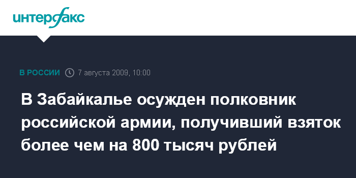 В Забайкалье осужден полковник российской армии, получивший взяток более чем на 800 тысяч рублей