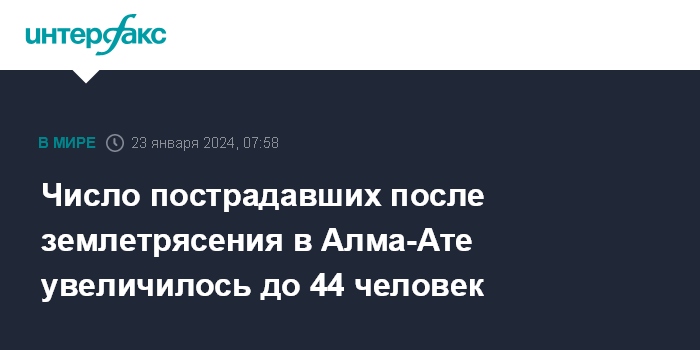 Москва. 23 января. INTERFAX.RU - За медицинской помощью с различными травмами в результате землетрясения в Алма-Ате обратились 44 человека, сообщила пресс-служба Минздрава республики.