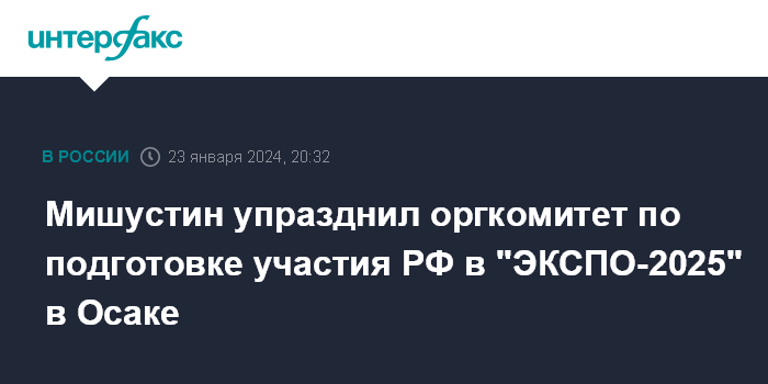 Москва. 23 января. INTERFAX.RU - Премьер РФ Михаил Мишустин подписал распоряжение об упразднении оргкомитета по подготовке участия России во Всемирной выставке "ЭКСПО-2025", которая пройдет в городе Осака (Япония).