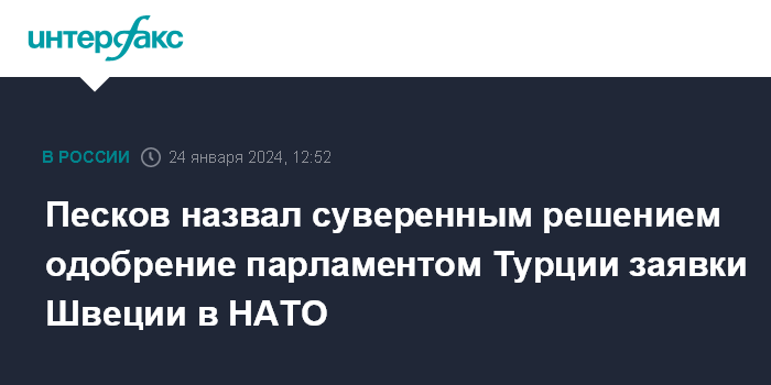Москва. 24 января. INTERFAX.RU - Одобрение парламентом Турции заявки Швеции на вступление в НАТО является суверенным решением этой страны, заявил пресс-секретарь президента РФ Дмитрий Песков.