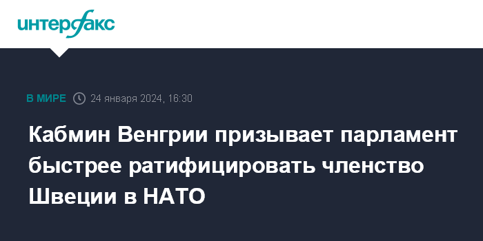 Москва. 24 января. INTERFAX.RU - Премьер Венгрии Виктор Орбан в среду в телефонном разговоре с генсеком НАТО Йенсом Столтенбергом заявил, что венгерское правительство призовет парламент как можно быстрее ратифицировать членство Швеции в альянсе.
