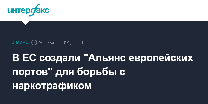 Москва. 24 января. INTERFAX.RU - Для борьбы с растущим наркотрафиком через морские и речные порты Евросоюза учреждена специальная структура "Альянс европейских портов", сообщили в среду в Еврокомиссии.