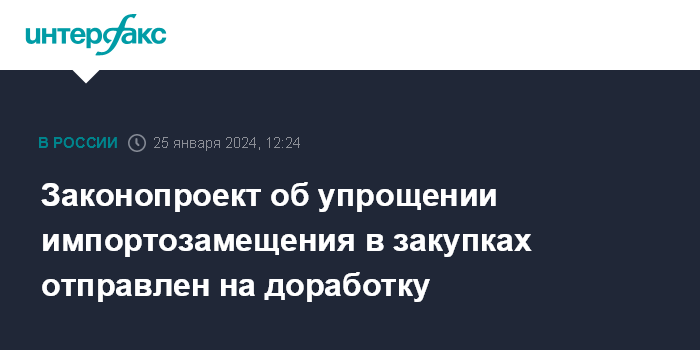 Москва. 25 января. INTERFAX.RU - Правкомиссия по законопроектной деятельности отправила на техническую доработку проект поправок к закупочному законодательству о правилах импортозамещения, сказал "Интерфаксу" замминистра финансов Алексей Лавров в кулуарах конференции "Практика проведения закупок в рамках 223-ФЗ в 2024 году".