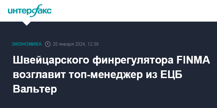 Москва. 25 января. INTERFAX.RU - Штефан Вальтер возглавит швейцарскую Службу по надзору за финансовыми рынками (Financial market supervisory authority, FINMA) с 1 апреля 2024 года, сообщила пресс-служба регулятора.