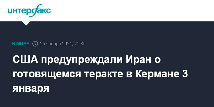 Москва. 25 января. INTERFAX.RU - Власти США заранее предупредили Иран о готовящейся ячейкой группировки ИГ (запрещена в РФ) "Вилаят Хорасан"(запрещена в РФ) террористической атаке в городе Керман 3 января, в результате которой погибли 95 человек. Об этом сообщает в четверг Associated Press со ссылкой на источник.