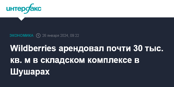 Москва. 26 января. INTERFAX.RU - Wildberries арендовал у онлайн-ритейлера "Всеинструменты.ру" часть складского комплекса, находящегося в Шушарах (Пушкинский район Санкт-Петербурга), сообщает газета "Ведомости" со ссылкой на консультантов.