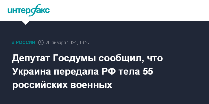 Москва. 26 января. INTERFAX.RU - Украинская сторона передала России тела 55 российских военнослужащих, сообщил "Интерфаксу" в пятницу первый заместитель председателя комитета Госдумы по международным делам Шамсаил Саралиев.
