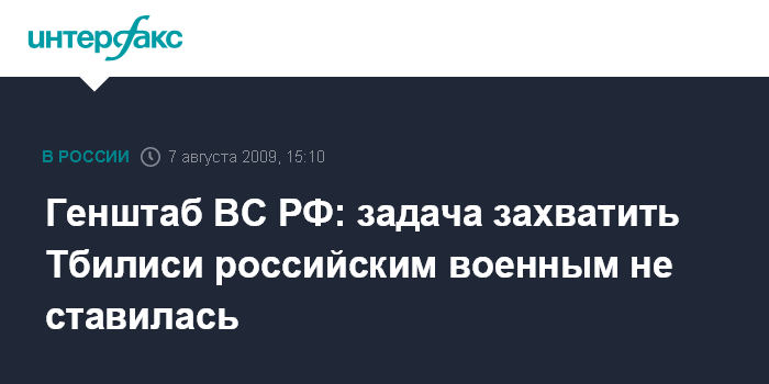 Москва. 7 августа. INTERFAX.RU - Замначальника Генштаба ВС РФ генерал-полковник Анатолий Ноговицын заявил, что никаких планов по захвату Тбилиси у российских войск в ходе прошлогодних событий не было. "Если бы мы имели задачу захватить Тбилиси, мы бы его захватили, но такой задачи нашим войскам не ставилось изначально. В обращении президента России четко была обозначена форма наших действий - они должны были принудить Грузию к миру", - сказал Ноговицын в пятницу журналистам в Москве.