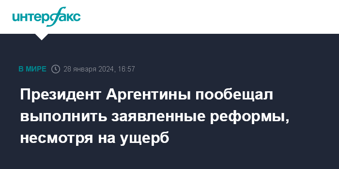Москва. 28 января. INTERFAX.RU - Президент Аргентины Хавьер Милей заявил, что выполнит предвыборные обещания встряхнуть экономику государства, несмотря на ущерб, который реформы могут нанести стране. Об этом он рассказал в интервью изданию The Wall Street Journal.