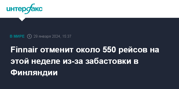 Москва. 29 января. INTERFAX.RU - Финская авиакомпания Finnair планирует отменить около 550 рейсов 1 и 2 февраляв связи с политической забастовкой в стране, сообщила пресс-служба авиаперевозчика.
