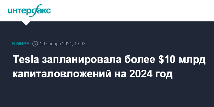 Москва. 29 января. INTERFAX.RU - Капиталовложения американского производителя электромобилей Tesla Inc. в 2024 году превысят $10 млрд и составят от $8 до $10 млрд в последующие два года, говорится в годовом отчете компании.