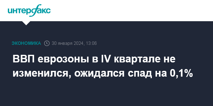 Москва. 30 января. INTERFAX.RU - ВВП еврозоны в четвертом квартале 2023 года не изменился по сравнению с предыдущими тремя месяцами, говорится в отчете статистического управления Европейского союза, представившего предварительные данные.
