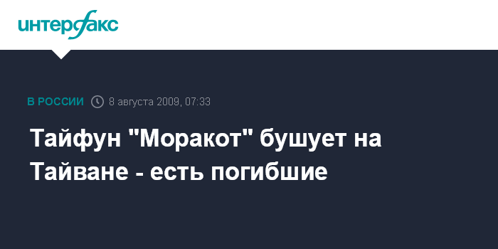 Москва. 8 августа. ИНТЕРФАКС - На Тайвань обрушился тихоокеанский тайфун "Моракот", погиб один человек ,14 человек ранены или пропали без вести, сообщил российский телеканал "Вести" в субботу утром.