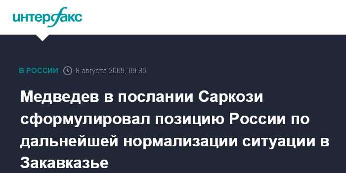 "В те дни подключение Франции в качестве председателя Европейского союза к нашим усилиям по прекращению развязанной М.Саакашвили агрессии было эффективным и результативным. Фактически договоренности от 12 августа и 8 сентября 2008 года по-прежнему остаются единственным "кодексом поведения" в этом районе Закавказья", - говорится в послании российского президента.