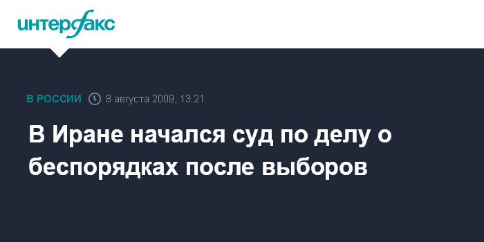 Тегеран. 8 августа. INTERFAX.RU - Второе заседание суда по рассмотрению дела организаторов недавних массовых беспорядков в Иране открылось в Тегеране, сообщает телерадиокорпорация Би-Би-Си со ссылкой на иранские СМИ.