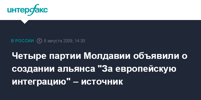 Кишинев. 8 августа. INTERFAX.RU - Четыре политические партии, которые до выборов 29 августа в парламент Молдавии находились в оппозиции к партии коммунистов, заявили о создании альянса "За европейскую интеграцию".