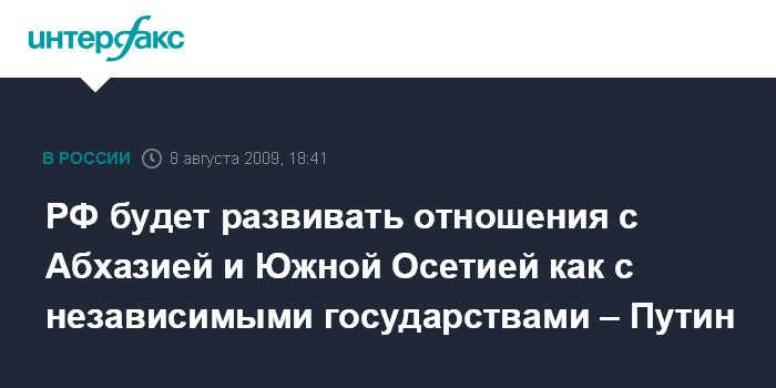 "Ситуация стала более определенной, абсолютно определенной, ясной и понятной. Созданный правовой базис позволяет нам развивать отношения и с Абхазией, и с Южной Осетией уже как с независимыми государствами, без всяких оглядок на тех, кому это не нравится. И на этой базе строить отношения по развитию экономики и социальной сферы, развивать межгосударственные связи, обеспечивать стабильность и безопасность", - заявил В.Путин в Сочи в субботу, отвечая на вопрос журналистов.