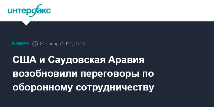Москва. 31 января. INTERFAX.RU - США и Саудовская Аравия прервали паузу в переговорах по укреплению оборонного сотрудничества, которая была вызвана началом Израилем военной операции в секторе Газа, сообщило агентство Bloomberg со ссылками на информированные источники.