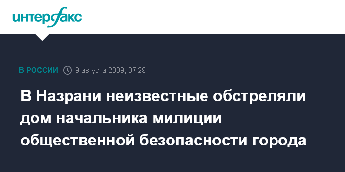 Ростов-на-Дону. 9 августа. ИНТЕРФАКС-ЮГ - Дом начальника УВД МВД РФ по Назрани был обстрелян неизвестными ночью.