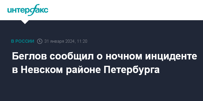 Москва. 31 января. INTERFAX.RU - Следственные мероприятия идут в Петербурге после ночного инцидента в Невском районе города, сообщил в соцсетях губернатор Александр Беглов в среду.