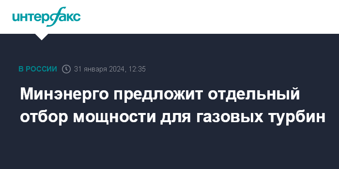 Москва. 31 января. INTERFAX.RU - Минэнерго предлагает рассмотреть отдельный отбор мощности именно газовых турбин в энергетике, сообщил замглавы ведомства Павел Сниккарс на заседании думского комитета энергетики.